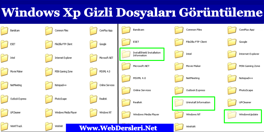 İşte bu kadar bu günde “Windows Xp Gizli Dosyaları Görüntüleme” adlı konumuzu yayınladık benzer konumuz olan “Windows Xp Dosya Uzantılarını Gösterme” Adlı Konumuzu İnceleye Bilirsiniz…